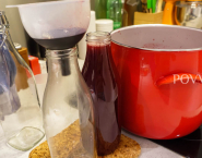 Na druhý deň preceď ovocie do veľkého hrnca tak, aby si zachytila čo najviac ovocnej šťavy. K šťave primiešaj sirup z bazových kvetov a vanilku, na vyrovnanie kyslastej chuti ovocia. Všetko priveď do varu a nechajjemne vyvariť až na sirupovú štruktúru.