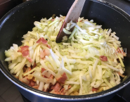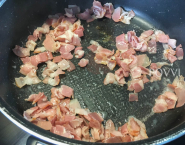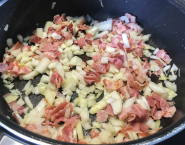 Slaninu opeč vo veľkej panvici na miernom ohni za častého miešania do chrumkava; asi 5 minút. Pridaj cibuľu a cesnak a popraž, kým cibuľa nezmäkne, približne ďalšie 3 minúty.