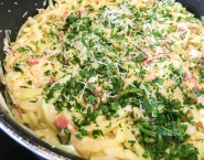 Ozdob nasekanou petržlenovou vňaťou a nastrúhaným parmezánom a ihneď podávaj.