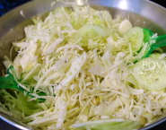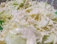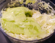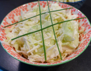 Kapustu očisť, odstráň hlúbik a v kuch.robote, alebo na mandolínke ju nakrájaj na jemné rezance. Rovnakým spôsobom spracuj aj buľvu feniklu. Uhorku olúpaj a tiež nastrúhaj na mandolíne, alebo v robote. Pažítku nakrájaj najemno a pridaj k zelenine.