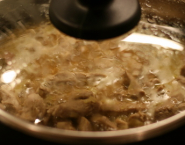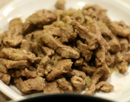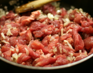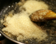 Hrozienka necháme nabobtnať vo vlažnej vode. Potom ich z nej vyberieme a necháme odtiecť. Cibuľu očistíme a nakrájame na jemno. Maslo v panvici rozpálime a cibuľu na ňom orestujeme. Bravčovú panenku nakrájame na rezance a pridáme k cibuli. Opekáme spolu asi 10 minút. Rezance v panvice vyberieme a do panvice pridáme cukor. Počkáme, kým skaramelizuje.