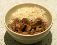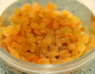 Rezance vložíme spať do panvice, pridáme hrozienka, sójovú omáčku a 3 dl vody a dobre zamiešame. Privedieme do varu a počkáme, kým omáčka troška zhustne. Podávame okamžite s pripravenou ryžou.