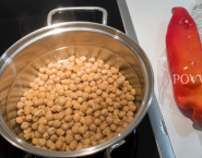 Cícer namoč na hodinku do vriacej vody (alebo namoč deň vopred). Potom vodu zlej a daj ho variť na ďalšiu hodinku spoločne s 1 čl sódy bikarbóny. Po uvarené ho sceď a drž bokom.