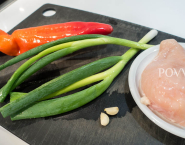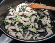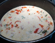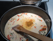 Cibuľku nakrájaj na kolieska a daj opražiť na 3 Pl oleja, spoločne s pretlačeným cesnakom. Potom pridaj na rezance nakrájané kuracie filé a opraž zo všetkých strán. Keď je opražené, pridaj na tenšie rezance nakrájanú kapiu a popraž chvíľku spoločne. Nakoniec zalej kokosovým mliekom, primiešaj kari korenie a nechaj spolu variť.