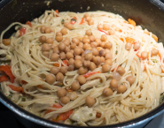 Medzitým, podľa návodu na obale priprav špagety. Keď sú al dente, sceď ich a pridaj k mäsku v kokosovej omáčke. Nakoniec primiešaj aj uvarený cícer, dôkladne spolu všetko premiešaj a prípadne dochuť soľou a korením.