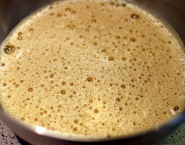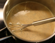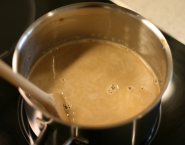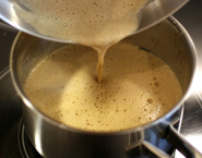 V miske rozšľahaj žĺtka a potom do nich v tenkých prúdoch prilievaj kávové mlieko. Prelej do hrnca a za ustavičného miešania drevenou vareškou priveď do varu na miernom plameni, až omáčka zhustne a začne sa na vareške lepiť ako lekvár.