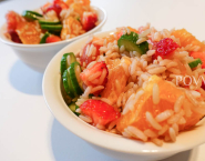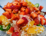 Citrusové ovocie nakrájaj à la vif a potom na plátky. Prebytočnú šťavu zachyť do misky. Uhorky umy a nakrájaj na kolieska. Ryžu uvar v jemne osolenej vode s 1 PL oleja. Sceď ju a nechaj vychladnúť. Potom k nej primiešaj citrusové plátky, uhorku a na malé kúsky nakrájané jahody.
