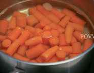 Mrkvu očisť, prekroj pozdĺžne napoly a nakrájaj na kúsky dlhé max. 4 cm. Ja som mala mladú, tak som ju nechala vcelku alen nakrájala na kúsky. Vlož ju do vriacej vody s cukrom a soľou a var počas 7 minút. Po uvarení má byť mäkká, ale nesmie sa rozpadávať.