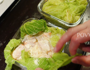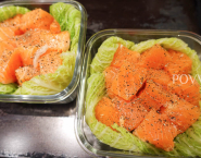 Lososa nakrájaj na väčšie kúsky. Do zapekacích misiek vlož po 4 pripravené listy, na ne poukladaj kúsky lososa, ochuť korením a veľmi jemne soľou (losos je prirodzene slaný) a zalej zopár lyžicami omáčky. Listy kelu prelož cez kúsky lososa, aby bol nimi zakrytý.