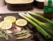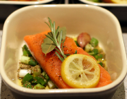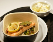 Rúru predhrej na 200°C. Zemiaky umy, olúpaj, uvar v solenej vode a drž v teple. Cibuľky nakrájaj na kúsky. Citrón nakrájaj na plátky a opeč na olivovom oleji spolu s neolúpanými strúčikmi cesnaku do zlata. Rozdeľ cibuľku a opečený cesnak do zapekacích misiek. Posyp oregánom a prelož kúskom lososa. Ten pokvapkaj olivovým olejom a posyp soľou a korením. Na vrch ulož bobkový list, vetvičku tymiánu a plátok citróna a dobre zakry alobalom. Daj piecť na 20 minút.