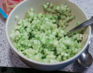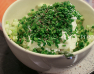 Uhorku a jablko nakrájaj na malé kocky a zmiešaj ich s tvarohovou nátierkou a pažítkou.