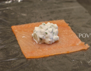 Plátky lososa nakrájaj na kocky a ulož ich na kúsok fólie. Doprostriedka polož za lyžičku tvarohovej zmesi. Dvihni rohy fólie tak, aby sa tvarohová zmes obalila lososom, dobre ju na konci zatoč, aby vytvorila pralinku a nechaj 1 na hodinu stuhnúť v chladničke.