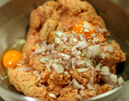 Rúru predhrej na 200°C. Šalotku nakrájaj najemno a zmiešaj ju v mise spolu s mletým mäsom, vajciami, horčicou, soľou, muškátovým orieškom, strúhankou a korením. Strúhanku pridávaj v malých dávkach, lebo jej množstvo závisí aj od kvality a mastnoty mäsa. Zmes nemá byť ani suchá ani tuhá.