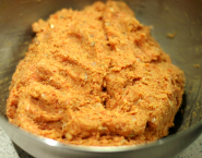 Pekáč vymaž tukom a mäsovú zmes doň ulož v tvare nevysokého chleba. Pritlač frikandon mokrými rukami na plocho, aby sa pekne ulhladil a predišlo sa jeho praskaniu pri pečení. Môžeš doň spraviť aj niekoľko zárezov ako do chleba. Posyp ho po povrchu strúhankou (1-2 PL), oblož zvrchu niekoľkými orieškami masla a podlej troškou vody.