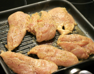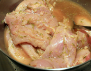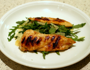 Marináda: zázvor, sojovú omáčku, med, polovicu limetkovej šťavy a polovicu nastrúhanej kôry vlož do misy a dobre zamiešaj. Trocha z nej odlož nabok na poliatie rucoly. Kuracie prsia prekroj pozdĺžne napoly a marinuj 15 minút.