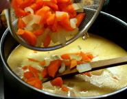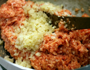 Kúsky zeleru a mrkvy upar, alebo uvar v jemne osolenej vode. Zemiaky uvar rovnako v mierne osolenej vode a sceď. V kúsku masla opraž najemno nasekanú šalotku a cesnak. Medzitým k mletému mäsu primiešaj žĺtky a soľ s korením. Pridaj podusenú šalotku s cesnakom a dobre spolu premiešaj.