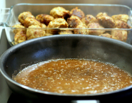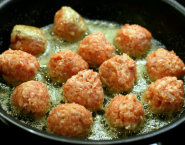 V panvici roztop kúsok masla. Pomocou dvoch lyžíc vytvaruj z mäsovej zmesi knedlíčky a tie na masle opraž do zlatista. Mäsové knedlíky vyber z panvice a výpek zalej kuracím bujónom. Omáčku preceď, vráť naspäť na sporák, pridaj smotanu a kasekané zrnká zeleného korenia a nechaj spolu trocha prevariť.