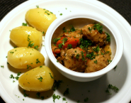 Do omáčky teraz pridaj mäsové guľky aj zeleninu, pridaj nasekanú petržlenovú vňať a podávaj s varenými zemiakmi.