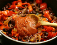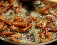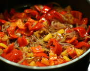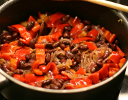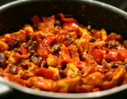 Rozpáľ panvicu, opraž na nej slaninku do chrumkava a odlož nabok. Do panvice vlož kuracie rezance, ochuť soľou a korením a opeč ako na soté. Mäso vyber, prelož ku slaninke a drž spolu prikryté alobalom. Papriky očisť, vyber jaderníky a nakrájaj ich na širšie rezance. Cibuľu očisť a nakrájaj na kolieska. Do panvice nalej trocha olivového oleja, cibuľu na ňom opeč a keď je sklovitá, pridaj aj papriky, na kocky nakrájané paradajkové kocky, a ak chceš burritos pikantné, pridaj aj chilli. Dochuť podľa potreby soľou a korením a opeč do mäkka. Teraz pridaj fazuľky, mäso a paradajkovú omáčku a nechaj všetko prejsť varom.