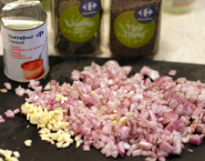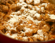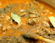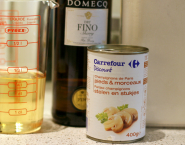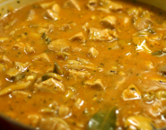 Morčacie mäso nakrájaj na kúsky ako na guláš a opeč na tuku v kastróle osolené a posypané čiernym korením. Keď je mäso opražené, pridaj na jemno nakrájanú šalotku, cesnak a paradajkový pretlak. Zamiešaj, nechaj chvíľku povariť a posyp múkou, aby sa vytvoril základ pre omáčku. Teraz zalej vínom a bujónom, pridaj bobkový list a tymián, priveď do varu, zamiešaj, zníž plameň a nechaj asi 75 minút prikryté a na jemnom plameni dusiť. Počas dusenia pravidelne zamiešaj, aby sa mäso, ani omáčka nepripálili. Asi 15 minút pred dokončením pridaj šampiňóny a nechaj dodusiť. Dochuť podľa potreby soľou a korením.