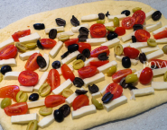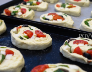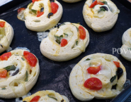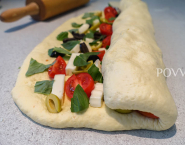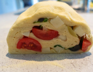 Po vykysnutí zbi cesto a hnieť 2-3 minúty na jemne posypanej doske. Vyváľaj ho na obdĺžnik cca 25 x 33 cm. Posyp ho rovnomerne paradajkami, mozzarellou a bazalkou a zroluj ho z dlhšej strany do válca. Chvíľku ho váľaj hore-dole a potom z neho nakrájaj 12 rovnakých kúskov (cca 2,5 cm hrubých). Tie polož reznou stranou na vymastený plech a nechaj ešte 15 minút (alebo kým zdvojnásobia svoj objem) podkysnúť, prikryté vlhkou utierkou.