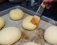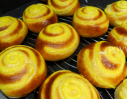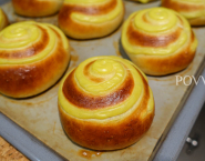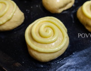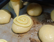 Po 30 minútach sprav skolebollers potri rozľahnutým vajcom a druhým cukrárskym vreckom striekaj na buchtičky ten istý krém, ale v tvare špirály (viď foto). Peč ich cca.10-12 minút do zlatohneda. Po upečení nechaj vychladnúť na mriežke.