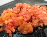Najprv priprav paradajky: nakroj ich do kríža, vlož ich do misy a prelej vriacou vodou. Počkaj minútku a potom ich prelož na krátko do ľadovej vody. Nakoniec vodu zlej a paradajky olúpaj. Potom ich prekroj na poly a vnútro so šťaviu odstráň. Osobne som použila mäsité paradajky, takže som mala menej odpadu aj šťavy.