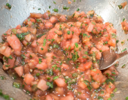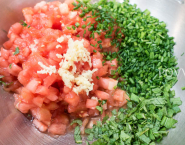 Paradajky nasekaj na malé kocky, pridaj pretlačený cesnak, olivový olej, balzamikový ocot, mätu, pažítku, soľ a korenie. Všetko spolu dobre zmiešaj vo väčšej mise a podľa potreby prípadne ešte dochuť soľou a korením.