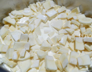Do hrnca vlož nakrájaný paštrnák, smotanu a vodu, prikry pokrievkou a var, kým paštrnák zmäkne. Sceď, smotanu zachyť a odlož a paštrnák vlož do mixéra. Pridaj trocha tekutiny, v ktorej sa varil a rozmixuj ho až je hladký a hebký. Dochuť a odlož nabok.