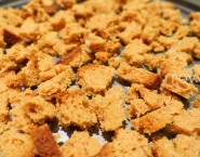 Predhrej rúru na 190°C/ plyn známkou 5. Perník rozdrob na malé kúsky a rozprestri ho na plech. Peč ho v rúre počas 3-4 minút, až sa mierne vysuší.