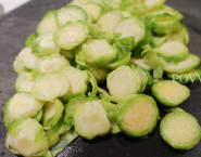 Ružičkový kel nakrájaj na tenké plátky a v malej panvici rozpáľ kúsok masla, kým začne peniť. Pridaj nakrájaný kel a premiešaj. Opekaj ich počas 1 minúty, potom ichz panvice vyber.