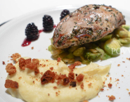 Ružičkový kel usporiadaj na tanieri v jednej línii naprieč stredom. Bažantie prsia ulož na ružičkový kel a pridaj za lyžicu paštrnákového pyré a ozdob ho opečeným crumble z perníka. Músko polej šťavou z výpeku, a vedľa neho ulož pred podávaním, na omáčku z nálevu, aj naložené černice.