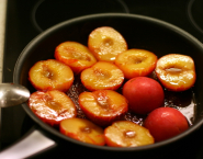 Ak chceme k mäsu podávať opražené ovocie: na panvici zmiešame 3 Pl cukru s troškou vody. Rozpolené slivky (broskyne, marhule alebo ananás) máčame v cukre a kladieme reznou stranou na panvicu a opekáme z oboch strán asi 6 minút.