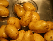 Do hlbšieho pekáča nalejeme na dno olivový olej a naň rozsypeme hrubozrnú morskú soľ. Celé zemiaky umyjeme pod tečúcou vodou a chvíľku necháme odtiecť. Potom ich po dĺžke prekrojíme na polovice a reznými stranami poukladáme na pekáč s olejom a soľou. Soľ na pekáči bude počas pečenia pôsobiť ako antiadhézny materiál, takže sa zemiaky upečú do chrumkava, ale nepripália sa na pekáč.