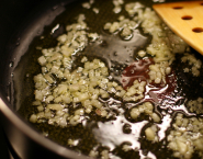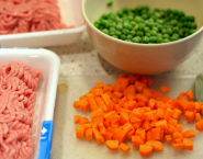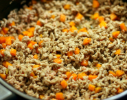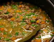 Uvar bujón. Šalotku nasekaj najemno a mkrvu pokrájaj na malé kocky. Šalotku a mrkvu spolu opraž na 1 PL olivového oleja. Pridaj mleté teľacie mäso a opeč ho na vysokom plameni. Zalej bujónom a pridaj bobkový list. Prikry to prikrývkou a var celé asi 5-6 minút.