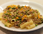 Cestoviny zlej a prelož na tanier. Prelej ich pripravenou omáčkou s mäsom a zvyškom oleja.