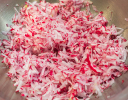 Reďkovky umy a nastrúhaj do misy ako jablká. Nechaj chvíľku postáť a potom z nej sceď prebytočnú tekutinu.