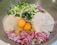 Aj cibuľky očisti, nakrájaj na kolieska a vlož do misy k reďkovke. Pridaj celozrnú múku, strúhanku a vajíčka. Ochuť soľou a korením a všetko spolu dôkladne premiešaj.