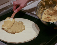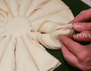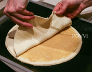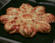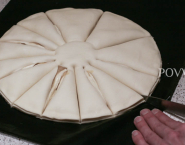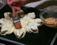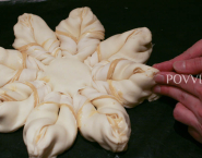 Koláč rozdeľ na 16 častí tak, aby si ho v prostriedku neprekrojila. Do rúk chyť dve vedľa seba ležiace časti cesta a stoč ich do vonkajších strán 2,5 krát. Prostriedky koncov spolu stlač a proces opakuj so zvyšnými časťami torty.