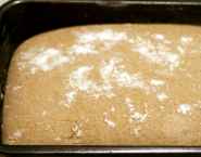 Po vykysnutí cesto zbi a vytvaruj do bochníka, vlož ho do maslom jemne vymastenej formy a nechaj ho neprikrytý kysnúť ďalších 55-60 minút. Medzitým predhrej rúru na 220°C (teplovzdušné rúry -20°C).