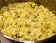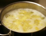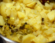 Z hrnca s dusenou zeleninou odstráň bouquet garni. Uvarené zemiaky sceď a primiešaj k dusenej zelenine. Ideálne zloženie pyré sú 2/3 zeleniny a 1/3 zemiakov.