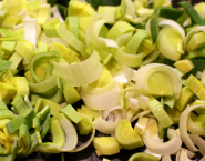 Cibuľu nakrájaj najemno a opraž do sklovita na masle. Daj pritom pozor, aby sa ti nepripálila a nesfarbila do hneda. Pór nakrájaj na kúsky a pridaj k opraženej cibuli.