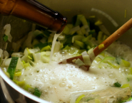Do hrnca so zeleninou pridaj biele pivo a nechaj povariť 15 minút na jemnom plameni.