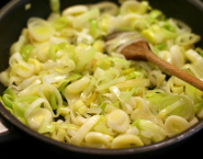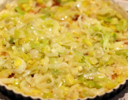 Rúru predhrej na 200°C (teplovzdušné rúry -20°C). Slaninku opraž na suchej panvici do chrumkava. Prelož na tanier vyložený kuchynskou papierovou utierkou a nechaj odkvapkať os masti. Do tej istej panvice nalej olivový olej a pridaj na kolieska nakrájaný pór. Opraž do mäkka a odstav. Lístkové cesto vlož do formy na pečenie a dno popichaj vidličkou. Na dno rozdeľ opraženú a odtečenú slaninku, na ňu navrstvi pór a celé to zasyp syrom. Vo vyššej nádobe spolu rozhabarkuj dve vajcia a 1,5 pochúťkovej smotany. Pridaj korenie a soľ a ešte dobre premiešaj. Celé to prelej na suroviny vo forme a vlož do rúry na 20-25 minút do červena upiecť. Podávaj s čerstvým zeleným šalátom.