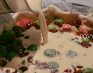 Plátky údeného ososa nakrájaj na rezance a primiešaj k rúžičkovému kelu. Premiešaj, vlož do pripraveného cesta vo forme a posyp brusnicami. Smotanu vymiešaj s vajciami, korením a soľou a prelej ňou pripravený kel a lososa v ceste.