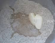 Múky zmiešaj spolu so soľou. Pridaj kyslú smotanu, tekutý kvások a čerstvé droždie, rozpustené v malom množstve vlažnej vody. Pridaj vodu a hnieť ruťne, alebo v kuch.robote. Cesto bude na dotyk mokré.