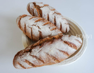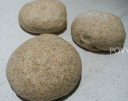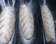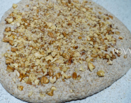 Prikry ho vlhkou utierkou a nechaj hodinu kysnúť. Po hodine ho zmies, rozdeľ na 3 časti, z každej vytvaruj bochník a nechaj ich pod utierkou 15 minút odpočinúť. Po 15 minútach do každého bochníka primies časť nasekaných orechov a každú časť zmies do podlhovastého tvaru. Chlebíky ulož na papierom na pečenie vyložený plech na pečenie a posyp ich ražnou múkou. Nakoniec na nich sprav zárezy v tvare rybacej kosti, ale medzi zárezmi nechaj časť cesta, hrubú ako palec, bez zárezu (viď foto).