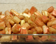 Rúru predhrej na 190°C (teplovzdušné rúry -20°C), plynový stupeň č.5. Rebarboru očisť a nakrájaj na kúsky hrubé 2 cm, vlož ich do nevysokej ohňovzdornej nádoby, posyp dobre cukrom a poriadne premiešaj. Prikry ju alobalom a vlož do rúry na 35 minút, až bude mäkká, ale nie rozvarená. Okamžite ju vyber z rúry, preceď a šťavu z nej ponechaj na neskôr; rúru zatiaľ nevypínaj.
