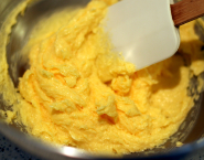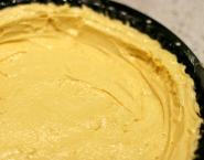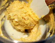Predhrej rúru na 180°C (teplovzdušné rúry -20°C). Maslo s cukrom miešaj do vzdušnej peny. Po jednom pridávaj žĺtka a zakaždým dobre premiešaj. Múku zmiešaj s práškom do pečiva a polovicu primiešaj k maslovej hmote. Primiešaj polovicu mlieka a potom aj zvyšok múky. Nakoniec primiešaj zvyšok mlieka. Cesto vlej do vymastenej formy a pritlač dobre na dne aj na stranách formy.
