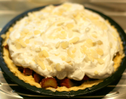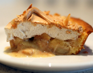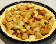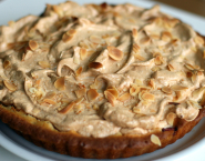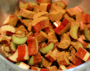 Na plnku zmiešaj kúsky rebarbory so škoricou a cukrom. Rebarboru pred krájaním, ani po ňom netreba nijako špeciálne upravovať. Zmes rozdeľ na dno formy vyložené cestom. Bielka vyšľahaj do jemného snehu, šľahajúc pridávaj po častiach cukor a vanilkovú esenciu a šľahaj až do pevného snehu. Sneh rozdeľ po “obláčikoch” na plnku a posyp mandľovými plátkami.